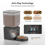 Lock in Freshness The automatic cat food dispenser preserves your pet food freshness with a desiccant bag and secure locking lid, preventing the food from becoming stale. The lid and hopper securely lock in place to prevent sneaky paws from raiding the feeder. The antijamming mechanisms ensure a seamless food dispensing experience. Note Not suitable for kibble over 15mm or wet food.